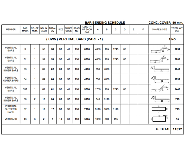Through the use of the detailed shop drawings, this procedure lists the various types of bars in each structural element. A detailed table is produced indicating diameter, shape, length of bars and number of bars for each part of the structure. This is then passed to the production team where tags are issued for each item.